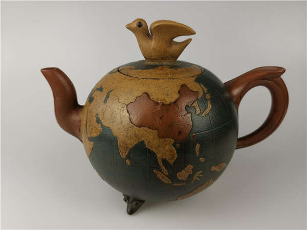 再說第二件,《世界和平壺》的回歸。2020年6月,唐朝霞老師的愛人韋強(qiáng)先生正在深圳商會開會。其間,一次會議結(jié)束后剛回到酒店時(shí)手機(jī)響起!一位美國的朋友電話給他告訴他一個天大的喜訊:在日本發(fā)現(xiàn)了唐朝霞爺爺唐鳳芝的傳奇作品“世界和平壺”。韋強(qiáng)介紹說,1943年,因?yàn)樘气P芝是民國時(shí)的紫砂大師,民國政府委托唐鳳芝先生特制了“世界和平壺”,隨后,由宋美齡女士在赴美國演講時(shí)一起帶了過去,象征著世界和平之意!想不到時(shí)隔80年,竟然在日本出現(xiàn)了。韋強(qiáng)說,看到實(shí)物照片時(shí),真的太激動了!此前,他們在家里只看到過爺爺設(shè)計(jì)的圖紙,從沒看到過實(shí)物,接到這意外訊息真的是驚喜萬分!真是難以入眠!通過一系列的協(xié)調(diào),日本的藏家愿意轉(zhuǎn)讓,讓激動的心更加興奮了,立即訂了機(jī)票,著手辦理“回歸事宜”。當(dāng)他終于在海關(guān)拿到了這件作品,包裝非常完好,便緊緊的抱在胸前:飄泊海外80年的“思念”終于落定了,爺爺唐鳳芝的“世界和平壺”終于回家了。韋強(qiáng)說:當(dāng)時(shí)的心情無法用言語形容!只覺得天空格外清新、陽光格外燦爛!