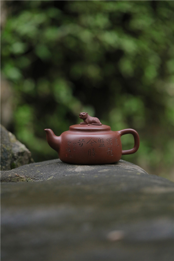 第四件,《臥虎藏龍壺》為平蓋、方肩、圓底,造型敦厚,穩(wěn)重古樸。壺鈕塑以遠(yuǎn)眺的臥虎,壺底則暗藏浮雕團(tuán)龍。兩者相向呼應(yīng),于平淡中藏奇趣。