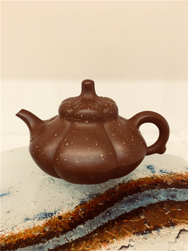 第五件,《笑雪壺》取材于中國傳統(tǒng)名花之梅花的形態(tài),壺鈕為花蒂,壺身等分成六瓣花瓣,圓潤飽滿,宛如盛開的梅花,壺嘴與壺把做成簡化的梅花枝干。顯得蒼勁鋼遒,壺以鋪砂做裝飾,以雪花紛紛飄落,表現(xiàn)出梅花傲霜迎雪,傳春報(bào)喜的吉祥寓意。此壺筋囊飽滿凝重,通體線條流暢,細(xì)節(jié)表現(xiàn)精巧,立意新穎,妙趣天成。