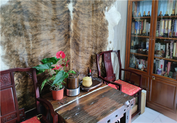 俗話說得好:見識一個素養(yǎng),看看他的書房就知道了!那么,寧起興老師的書房是什么樣的呢?第一印象:簡潔、古樸、有趣味。一眼掃去,臨窗一張紅木桌,兩個裝得滿滿的老書柜,兩張烏黑發(fā)亮的南官帽椅,中間配有一張老舊的喝茶的原木桌,正上方的墻面掛著一整張大大的南美阿根廷牛皮。墻上橫掃,掛有“室靜書馨”的書法作品,一張古琴,一把薩克斯,幾份有關(guān)他篆刻宣傳的剪報,還有星星點點的各類鈴鐺。細(xì)看呢:書柜里的篆刻工具書,有大部頭的字典、印譜和系列叢書,也有與篆刻相關(guān)的文化類書籍,大多插滿了顏色各異的標(biāo)簽,可見寧老師讀書的細(xì)致與用心。紅木大桌上有一對大音箱,是原裝進(jìn)口的德國貨;桌子旁,有一正方形的小桌特別顯眼,寧老師帶著些許自豪的神態(tài)介紹說,鉗臺是德國進(jìn)口的,鋸子也是原裝進(jìn)口的,那個刻銅印的印盤是定制的。還有,他所用的刻刀頂端印有l(wèi)ogo,是小篆“寧”字與工字的合寫,該刀鋼材鈷含量為17%,也是定制的。正所謂“工欲善其事,必先利其器”,寧老師深以為然。是以,他在工具上追求“高精尖”甚至不惜工本。