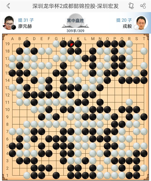 第三臺(tái)戎毅對(duì)陣廖元赫,開局行至第30、32手時(shí)出現(xiàn)失誤,致一隊(duì)白子被殲。此后,雖一路奮力追趕,行至309手時(shí)依然無力回天,遂認(rèn)輸告負(fù)。