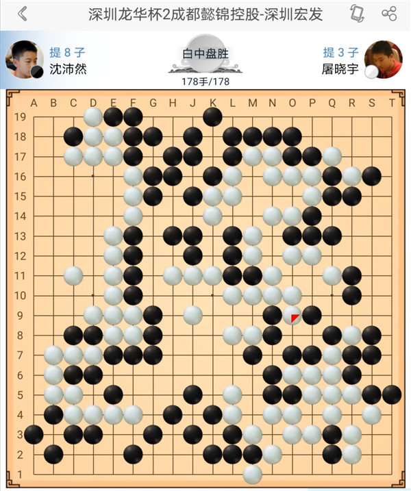 第四臺(tái)小將沈沛然執(zhí)黑對(duì)陣屠曉宇,行至178手時(shí),盤面形勢白微弱領(lǐng)先。大家認(rèn)為若努力收官或許有一線希望時(shí),沈沛然停鐘認(rèn)輸,也許是看清了形勢的無奈之舉吧。