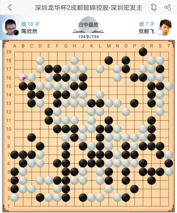 第二臺(tái)主將陶欣然執(zhí)黑負(fù)于世界冠軍黨毅飛。中盤中腹作戰(zhàn)白棋失誤,轉(zhuǎn)換后黑棋優(yōu)勢。之后左上角黑棋行棋過分,被白棋抓住機(jī)會(huì)吃住上方四子后一舉奠定勝局。