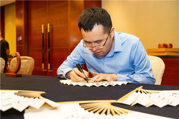 閉幕式上,嘉賓為圍棋愛好者折扇簽名。