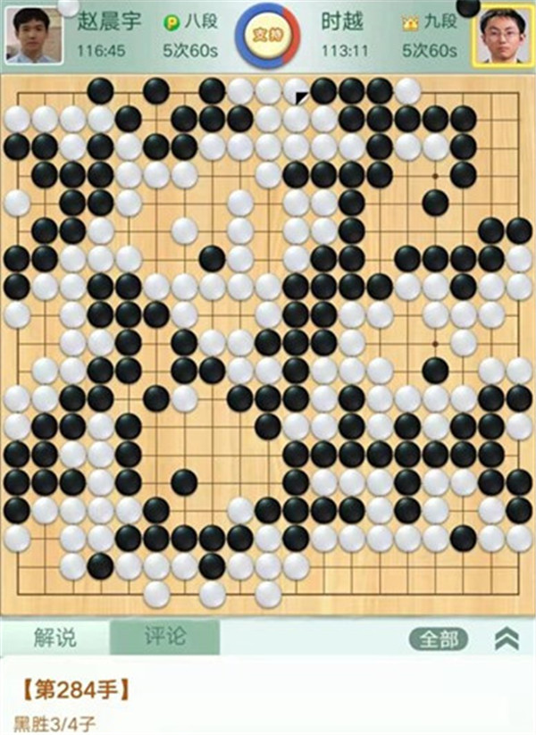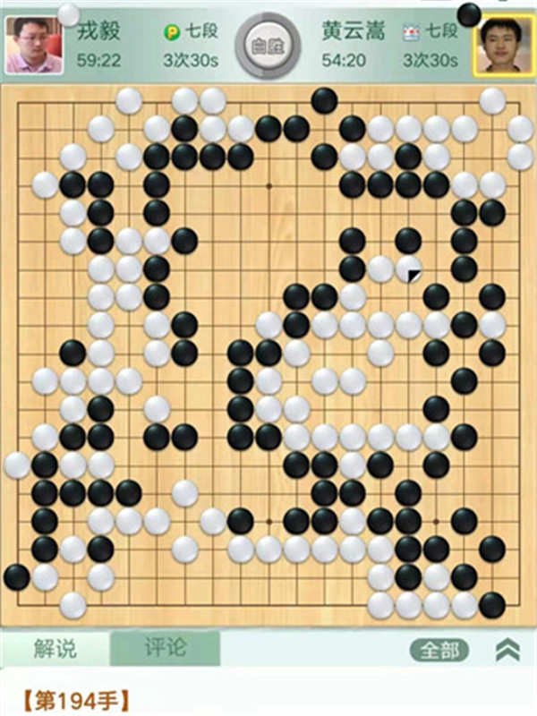 今日比賽中,申旻俊主將執(zhí)黑對陣新二冠羋昱廷,開局左上角申旻俊配合小米使出羋氏飛刀,結(jié)果是飛刀不成功黑棋局面領(lǐng)先。中盤黑棋攻擊中央白棋時,白棋脫先搶占實地。被黑手起刀落斬殺大龍,局終??炱迮_,去年屢立戰(zhàn)功的戎毅七段執(zhí)白對陣黃云嵩七段,行棋穩(wěn)健,占居三個角之后,又在中間活出一大塊,行棋至194手勝。三臺陶欣然八段對陣陳賢八段,行棋222手白中盤勝。四臺時越九段對趙晨宇一戰(zhàn),行至284手,以四分之三子微弱優(yōu)勢取勝。