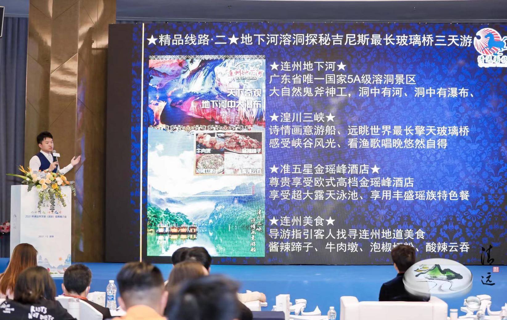文化是旅游的靈魂,旅游是文化的載體。近年來(lái),清遠(yuǎn)依托自然資源稟賦和深厚的文化底蘊(yùn),多措并舉推動(dòng)文旅融合發(fā)展,文旅產(chǎn)業(yè)呈現(xiàn)欣欣向榮局面?,F(xiàn)場(chǎng),清遠(yuǎn)市珠水美悅酒店管理有限公司總經(jīng)理宋玉亮、清遠(yuǎn)市古龍峽生態(tài)旅游娛樂(lè)有限公司營(yíng)銷專員林嘉儀、清遠(yuǎn)市愛(ài)地旅游發(fā)展有限公司營(yíng)銷經(jīng)理?xiàng)钍婧啤⑶暹h(yuǎn)市國(guó)業(yè)旅游開(kāi)發(fā)有限公司常務(wù)副總經(jīng)理韓勇,依次以圖文并茂、聲畫結(jié)合的形式,推介了美林湖景區(qū),古龍峽景區(qū),連州地下河、湟川三峽、龍?zhí)犊蜅?、擎天玻璃橋、連州大酒店,峰林曉鎮(zhèn)、洞天仙境,讓與會(huì)人員身臨其境感受山水清遠(yuǎn)的魅力;清遠(yuǎn)市國(guó)旅國(guó)際旅行社有限責(zé)任公司業(yè)務(wù)總監(jiān)李國(guó)華則現(xiàn)場(chǎng)推介了古龍峽云天玻霸兩天游、地下河溶洞探秘及吉尼斯最長(zhǎng)玻璃橋三天游等5條精品旅游線路,現(xiàn)場(chǎng)“種草”清遠(yuǎn)眾多網(wǎng)紅打卡點(diǎn)。