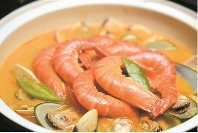 在東莞某國際大酒店,掌勺主廚將新鮮九節(jié)蝦去掉蝦腸洗凈,土豆切丁入油鍋香炸備用。熱鍋中放蔥蒜粒、洋蔥片和青紅椒片炒香,加入適量用雞肉與排骨熬就的高湯,倒入咖喱粉煮滾。依序滑入白貝、青口和九節(jié)蝦水燜煮去腥,待九成熟時(shí)分別撈起,以盡量保持海鮮的鮮嫩度。砂鍋底部平鋪一層炸好的土豆,分層碼上貝類、青口等海鮮,再淋透上熬好的香濃咖喱汁,海鮮鍋即大功告成。入口酸酸辣辣十分刺激開胃,輕而易舉激活味蕾。