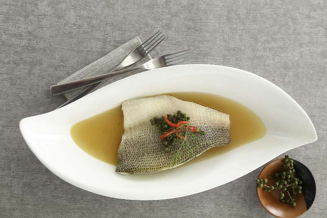 區(qū)別于充斥著辣椒與熱油的傳統(tǒng)水煮魚,梧桐 PLUS 的 fusion水煮魚外表清新,口感麻辣。食材選用三斤左右的上等淡水鱸魚,清晨宰殺,剔骨后整場(chǎng)取肉,再經(jīng)過(guò)高溫蒸制,保證魚肉肉質(zhì)嫩滑松軟。并不像傳統(tǒng)的水煮魚采用的“湯菜”的方式,fusion水煮魚采用肉料分離的烹飪方式。魚湯經(jīng)過(guò)麻椒、辣椒的熬煮而變得味道濃郁,過(guò)濾后僅留清爽的湯汁,單從視覺(jué)上根本無(wú)法判斷蘊(yùn)藏的奇妙味道,這也正是這道招牌菜的精妙之處。盛盤后的fusion 水煮魚猶如一道藝術(shù)品,造型簡(jiǎn)約充滿意境,清亮的魚湯入口瞬間酸辣感通透口腔,脫離了紅油浸泡的濃郁麻辣口感,更加健康養(yǎng)生。