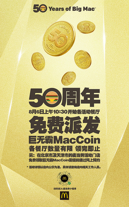 為了與中國消費者一起歡慶巨無霸50周年,中國內(nèi)地指定麥當勞餐廳將于2018年8月6日當日免費送出超過100萬枚MacCoin。早上10:30開始,顧客前往餐廳為巨無霸唱出生日歌[ 北京市和天津市的顧客需2018年8月4日上午9:00起在“i麥當勞”微信小程序提前預約,方可于8月6日10:30起在指定麥當勞餐廳領取。],即可獲得MacCoin一枚,圖案隨機,送完即止。北京市和天津市的顧客需2018年8月4日上午9:00起在“i麥當勞”微信小程序提前預約,方可于8月6日10:30起在指定麥當勞餐廳領取。顧客可以分享與收藏,也可以在2018年12月31日前憑MacCoin在中國內(nèi)地、美國、荷蘭、新西蘭、巴西等全球超過50個國家和地區(qū)參與活動的麥當勞餐廳,免費兌換巨無霸一個。