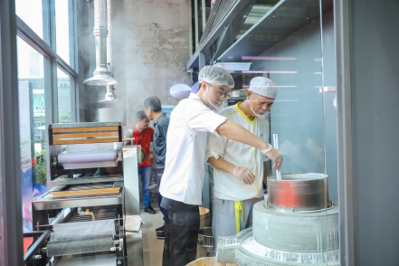 一般的越南河粉店用的是進口貨,就算來源再好,在運輸過程中總有味道和韌度的流失。傳統(tǒng)河粉機屬于大型設(shè)備,蔡瀾團隊經(jīng)過22個月的研發(fā)和改良,縮小尺寸才能將機器陳列于餐廳,讓顧客見證新鮮河粉生產(chǎn)制作的全過程:大米浸泡至軟,石磨磨成米漿再蒸熟、切割成河粉,用心打造出一碗新鮮美味的Pho。