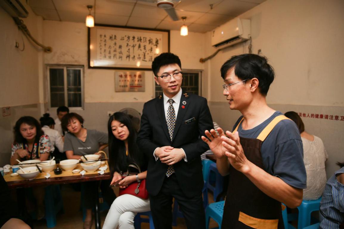 在禮賓司的引領(lǐng)下,大家來到已有千年歷史的文化遺產(chǎn)——南頭古城。一行人在“九街糖水鋪”入座,店主夫妻倆熱情的端出清甜可口的化州糖水和香氣四溢的潮州炒米粉,和我們嘮起了家長(zhǎng)里短。大家方才得知,這宛如尋常百姓家的糖水鋪竟開業(yè)于1995年,見證了古城九街的變遷翻新和故去新來的幾代人潮川流。帶著傳播化州糖水美名初衷的糖水世家選擇在深圳發(fā)家,傳到這已是第三代。眾人大快朵頤,禮賓司也幫忙跑堂添茶。