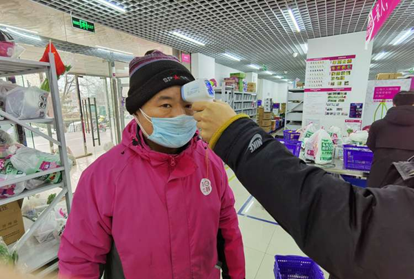 每日優(yōu)鮮工作人員為配送員測量體溫