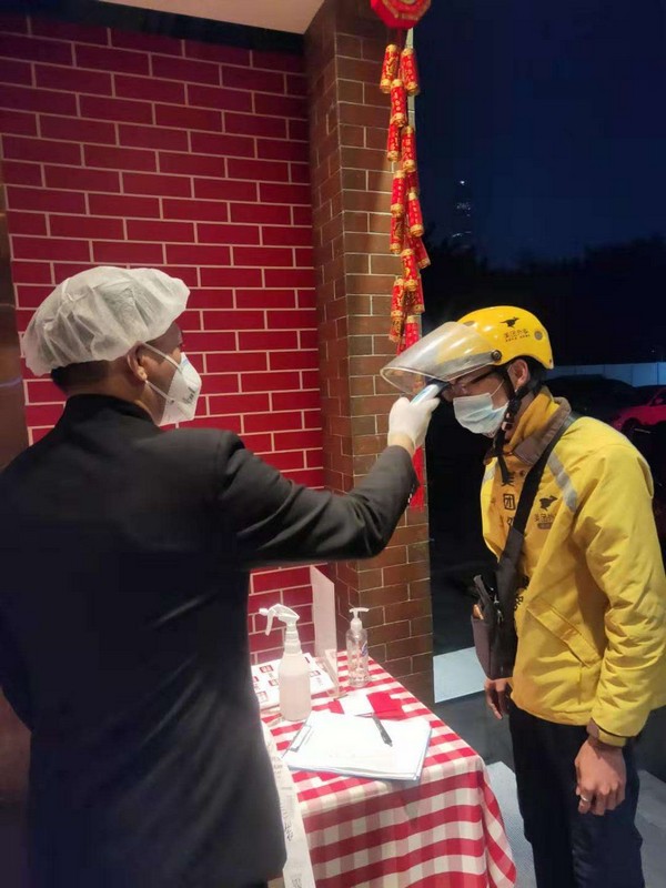 為了保障顧客和員工的健康,深圳西貝要求所有上班前的員工都需每半小時(shí)測一次體溫,每一個(gè)小時(shí)集中進(jìn)行洗手消毒,公司還為每一位員工配備了符合要求的防護(hù)口罩。不僅如此,來外賣取餐的騎手也和店員分割開在店門口取餐,減少人員之間相互交流與接觸,每個(gè)騎手取餐前,必須接受體溫測量,手部消毒,確認(rèn)無誤,才可取餐。