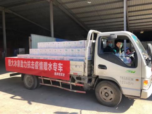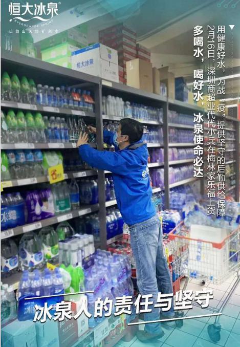抗擊疫情不停止,恒大冰泉除了捐贈物資提供愛心水,為了確保當?shù)仫嬘盟淖泐~供應,一批批恒大冰泉也在各大商場大量上架。