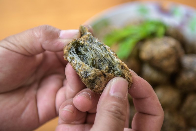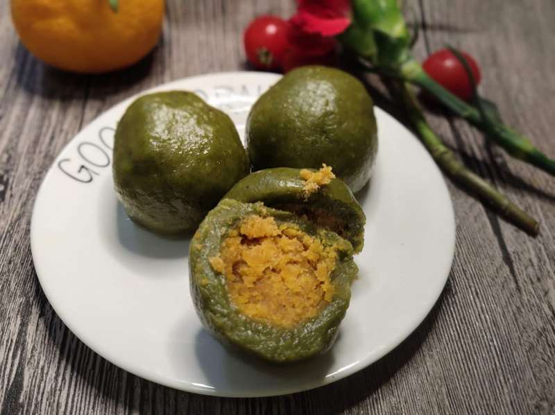 實(shí)際上,如果單純用艾草做青團(tuán)子,蒸熟后顏色暗沉偏黃,不一定特別好看,所以也有粵菜師傅發(fā)明一種改良的做法:用菠菜汁和艾葉汁混合,青團(tuán)子就呈現(xiàn)鮮綠的顏色。餡料方面,除了可以用最傳統(tǒng)的花生糖餡料,也可以用很多年輕人喜愛的咸蛋肉松餡,咸甜任君選擇。