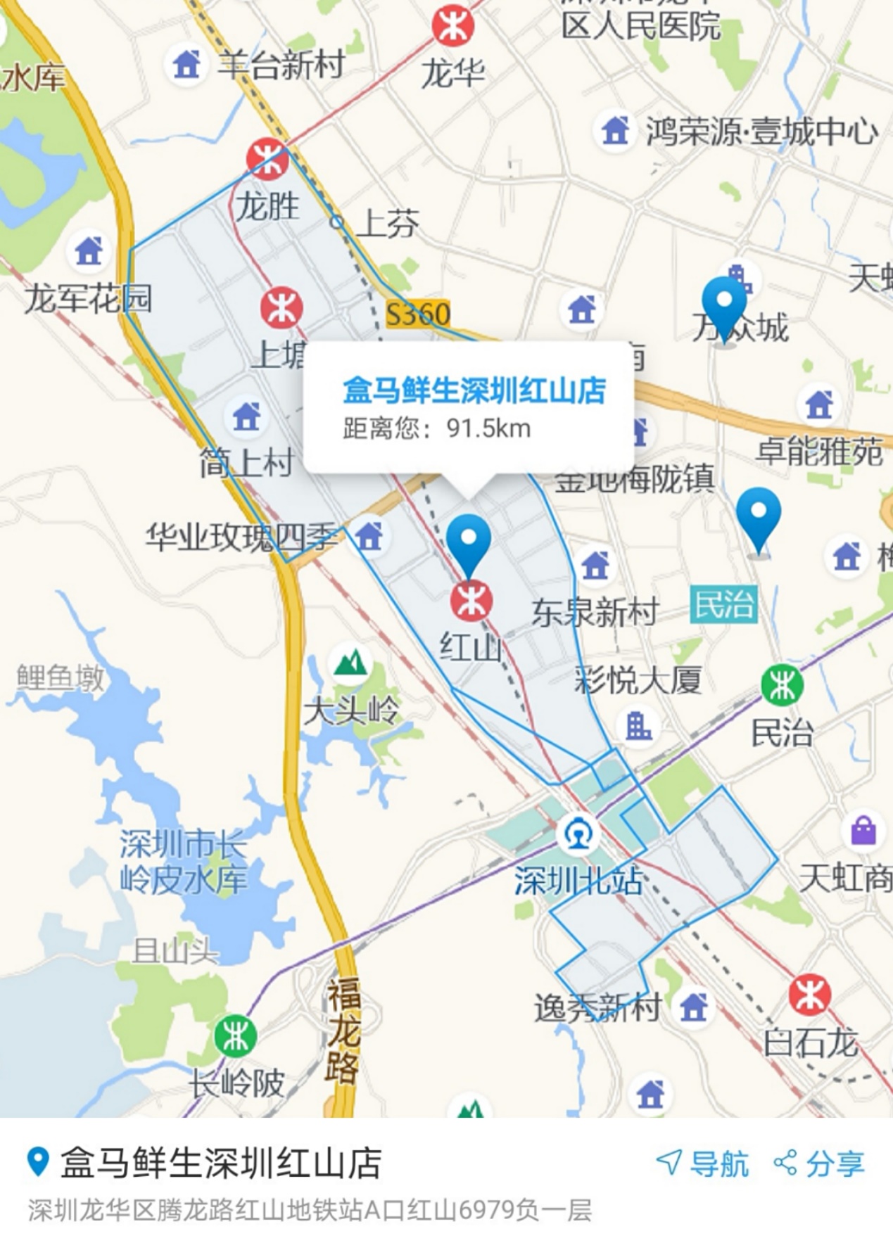 盒馬紅山店的“盒區(qū)房”覆蓋廣深港高鐵沿線,北至龍華區(qū)和平路,南至民豐路,橫跨三個(gè)地鐵站,而深圳最大的高鐵站深圳北站(外廣場)也在盒區(qū)范圍內(nèi)。大數(shù)據(jù)中心監(jiān)測,深圳北站商圈內(nèi)居住人口達(dá)到了30.8萬人,工作日客流約75.77萬人。