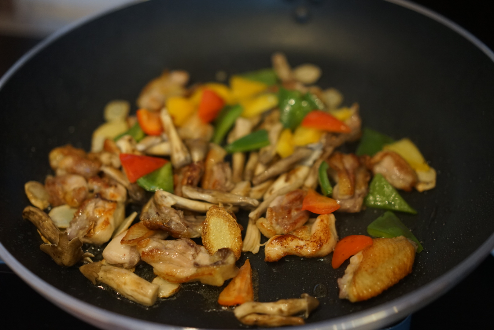 3、等雞肉大約7成熟時,加入沙姜片,用鐵勺輕輕兜炒雞肉與姜片,讓雞肉更加充分吸收姜的風(fēng)味。雞皮經(jīng)油溫加熱后,油脂滲出,將鍋中的油勺起,再淋到雞件與姜片上,充分融合。