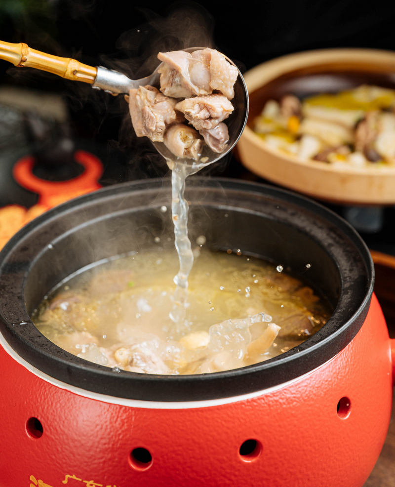 以雞為主要烹飪食材,洞庭土雞館的湖南師傅創(chuàng)造出了不一樣的菜肴。每桌食客坐下,都少不得一碗暖乎乎的洞庭土雞湯來(lái)“開(kāi)場(chǎng)”。它的登場(chǎng)也相當(dāng)有氣勢(shì),長(zhǎng)沙紅磚窯特別定制的大湯鍋,內(nèi)膽是紫砂構(gòu)造,這樣的設(shè)計(jì)既是出于美觀,又是出于更長(zhǎng)時(shí)間更有效保溫的效果。俗話說(shuō)得好,工欲善其事必先利其器。土雞方面,師傅特別精選了湖南竹山雞,肉質(zhì)的彈性略勝一籌,據(jù)介紹,竹山雞的養(yǎng)殖戶(hù)開(kāi)放了大片山頭讓雞跑,放養(yǎng)時(shí)間足夠長(zhǎng),達(dá)到一年多,在如今快節(jié)奏的社會(huì)里已實(shí)屬難得。老雞加山泉水文火熬3個(gè)小時(shí),并沒(méi)有其他的味道干擾,簡(jiǎn)簡(jiǎn)單單就是本味。
