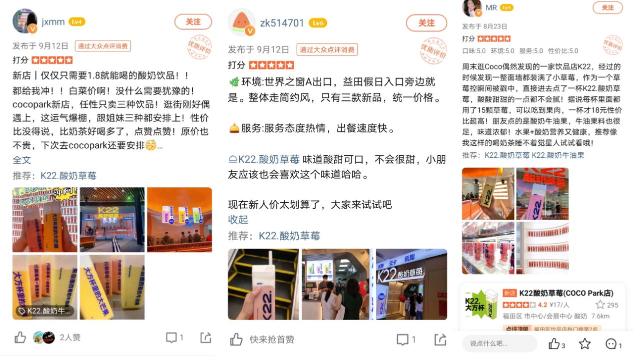 目前K22.酸奶草莓深圳門店已正式開業(yè),試營業(yè)期間已榮登大眾點評飲品熱門榜單并收獲了相當(dāng)不錯的人氣和好評,相信K22.酸奶草莓在深圳的市場發(fā)展一定能再創(chuàng)輝煌。