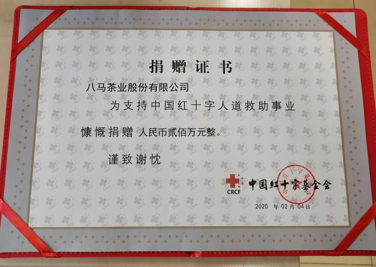 八馬茶業(yè)向中國(guó)紅十字基金會(huì)捐贈(zèng)人民幣200萬(wàn)元,用于支援新型冠狀病毒感染的肺炎疫情防控及防疫一線醫(yī)務(wù)人員發(fā)放人道救助金等工作。