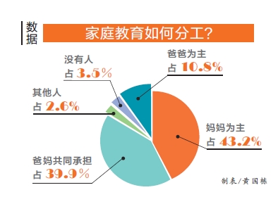 此次調(diào)查中,用14個(gè)指標(biāo)考察家庭教育分工情況,包括:輔導(dǎo)孩子學(xué)習(xí)、培養(yǎng)孩子特長(zhǎng)、接送孩子上下學(xué)、開(kāi)家長(zhǎng)會(huì)、培養(yǎng)孩子日常行為習(xí)慣、糾正孩子的不良行為、教孩子明辨是非、照顧孩子的飲食起居、和孩子一起游戲及和孩子聊天。統(tǒng)計(jì)數(shù)據(jù)顯示,家庭教育分工中,“媽媽為主”的家庭占43.2%,“爸爸為主”占10.8%,“爸媽共同承擔(dān)”占39.9%,“其他人做”占2.6%,“沒(méi)有人做”占3.5%。