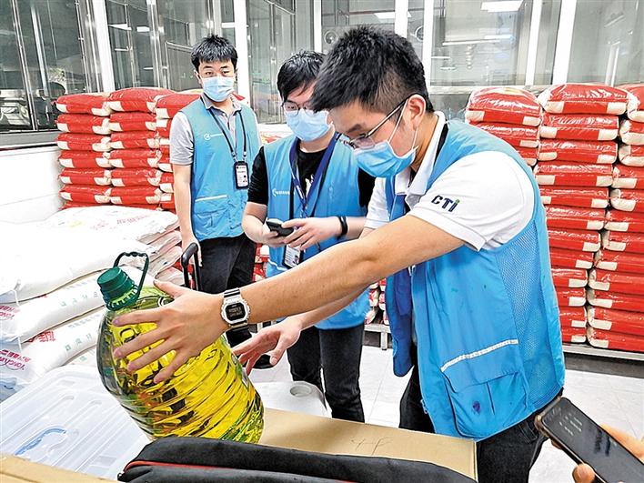 工作人員在學校食堂倉庫進行食品原材料抽檢。