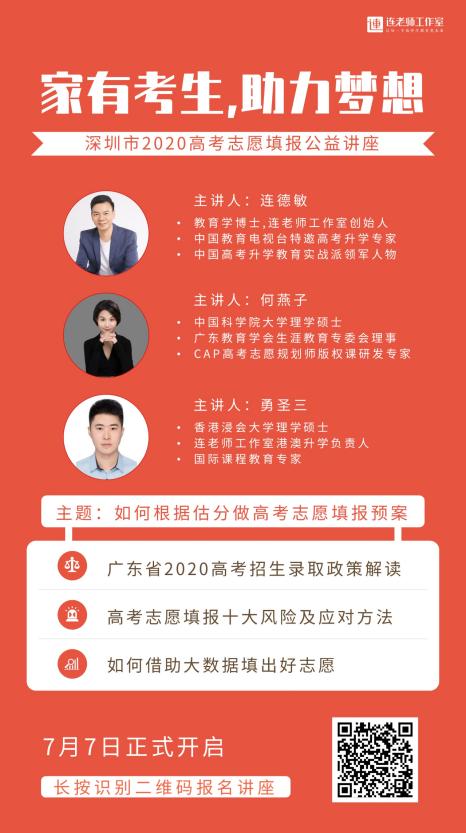據(jù)悉,連老師工作室深圳市2020高考志愿填報公益講座接下來還會連續(xù)舉辦四場線下公益講座,講座均由連德敏博士主講,以“如何根據(jù)分?jǐn)?shù)做高考志愿填報預(yù)案”為主題,解讀廣東省2020高考招生錄取政策,分享高考志愿填報十大風(fēng)險及應(yīng)對方法以及如何借助大數(shù)據(jù)填出好志愿等精彩內(nèi)容,幫助廣東省考生和家長更好的完成志愿填報。