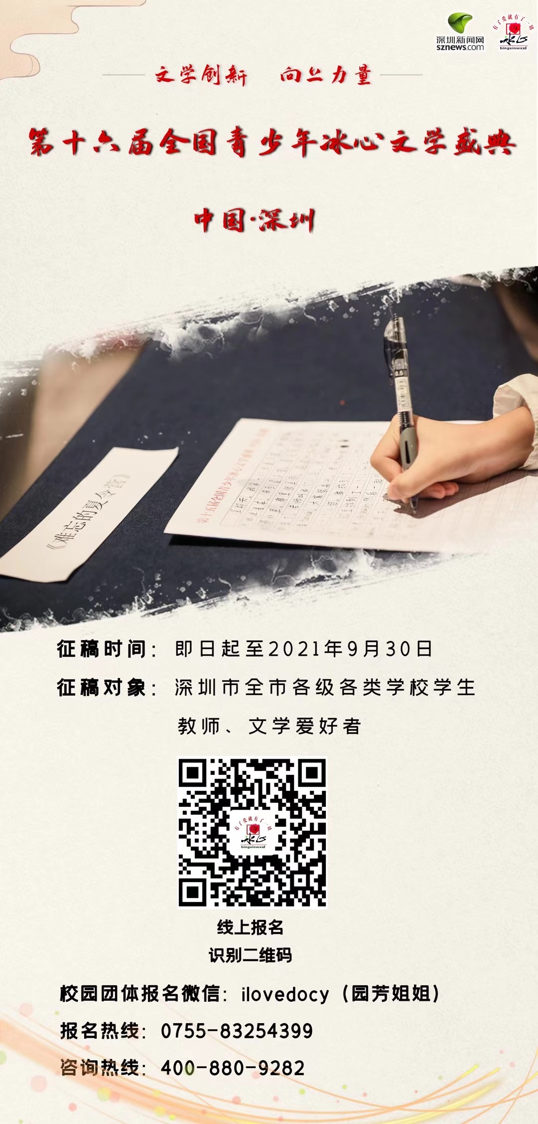見圳客戶端·深圳新聞網(wǎng)2021年3月2日訊 為繼承和發(fā)揚(yáng)中華文化及冰心文學(xué)精神,促進(jìn)中華文化、中國現(xiàn)代化文學(xué)史更深入地植入深圳下一代青少年心中,奠定堅實的中國社會主義現(xiàn)代化建設(shè)根基,2021年“第十六屆全國青少年冰心文學(xué)盛典中國·深圳”正在愛好文學(xué)的師生學(xué)友們之間熱烈展開。