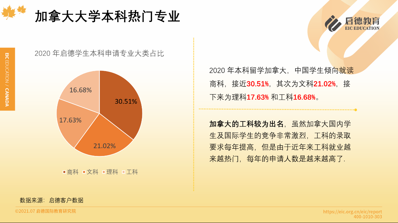 啟德留學(xué)客戶服務(wù)數(shù)據(jù)顯示,2020年加拿大本科階段,理工科專業(yè)占比34.31%,商科占比30.51%,文科21.02%,理工科的申請人數(shù)超過了商科。碩士階段選擇最多的專業(yè)是計(jì)算機(jī)工程(17.13% )、 MBA (9.99% )、金融(9.44% )與教育學(xué)(7.94% ),其他碩士熱門專業(yè)還有經(jīng)濟(jì)學(xué)、會計(jì)、數(shù)據(jù)科學(xué)、機(jī)械與能源工程、商業(yè)分析等。