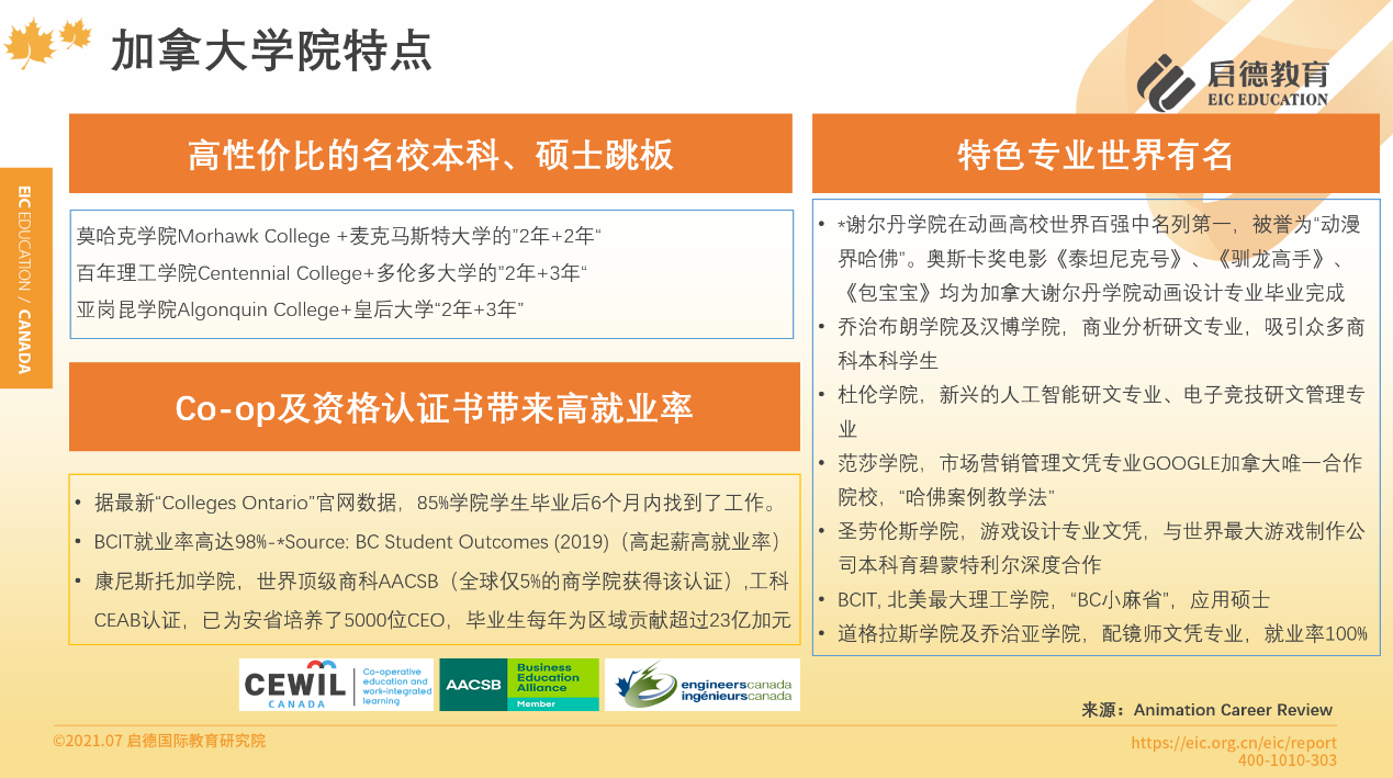 “ Colleges Ontario”官網(wǎng)數(shù)據(jù)顯示,85 %的學(xué)院學(xué)生畢業(yè)后6個月內(nèi)找到了工作,91%的雇主對學(xué)生表示非常滿意。如康尼斯托加學(xué)院,擁有世界頂級商科 AACSB與工科 CEAB認(rèn)證,為安省培養(yǎng)了5000位 CEO,畢業(yè)生每年為區(qū)域貢獻(xiàn)超過23億加元。而奧斯卡獎電影《泰坦尼克號》、《馴龍高手》、《包寶寶》均為加拿大謝爾丹學(xué)院動畫設(shè)計(jì)專業(yè)畢業(yè)完成。杜倫學(xué)院的人工智能專業(yè),道格拉斯學(xué)院的配鏡師專業(yè)也是世界有名的特色專業(yè)。