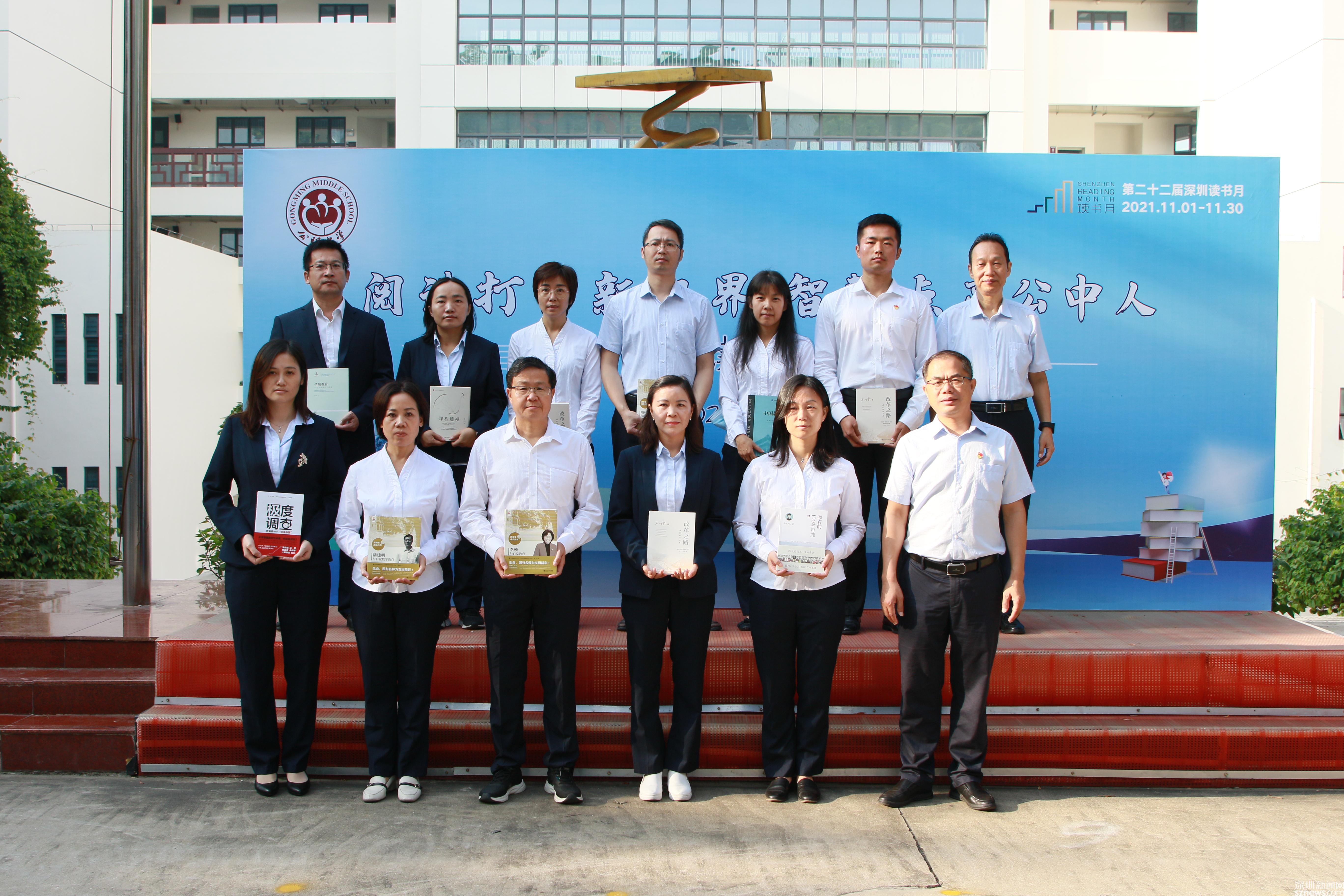 啟動儀式上,初二(15)班全體學(xué)生帶來的朗誦《我愿意 奮斗終生》,催人覺醒;深圳市閱讀推廣人范世華攜公明中學(xué)各年級閱讀之星代表——初三(8)李詩晨、初二(8)宛錚、初一(2)班胡立麒,共同向全校師生發(fā)出讀書、愛書的倡議;華建明校長、梁吉清副校長向?qū)W校各學(xué)科科組長贈書,希望科組長帶動備課組一起讀好書,研究書,用好書,通過博而精的閱讀提升人文素養(yǎng),建設(shè)學(xué)習(xí)型教師共同體,進(jìn)而更好在學(xué)生心中種下讀書的種子。