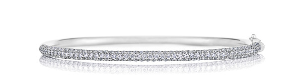Micropave三行密鑲手鐲靈感源自流星劃過的美妙光線,三行密鑲鉆石線條閃耀璀璨光芒,鉆石總重2克拉。立體圓弧表面的顆顆美鉆充分引入自然光線,與白金底托的光澤共耀純凈粹光。
