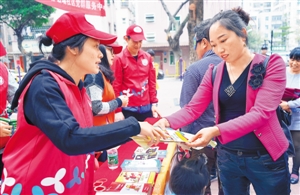 黨員志愿者向居民發(fā)放禁毒宣傳冊。