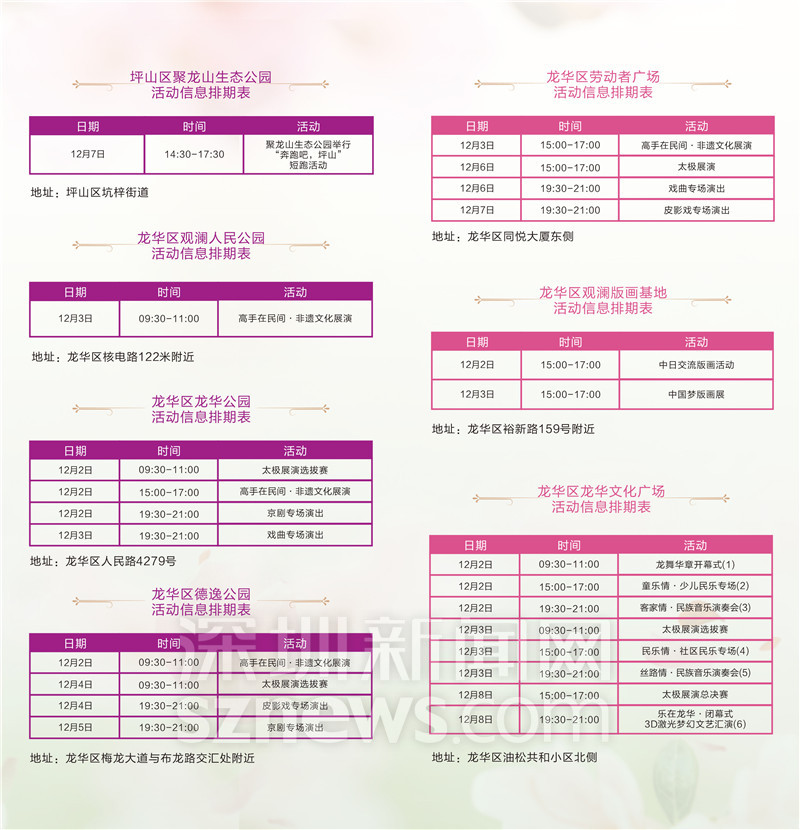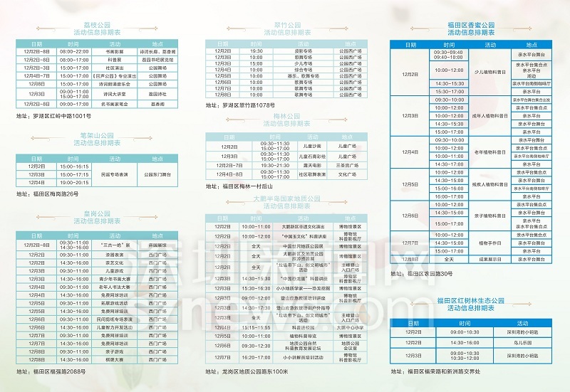 本屆公園文化周共設(shè)27個會場,其中市屬公園設(shè)11個會場,區(qū)屬公園設(shè)16個會場,這也是公園文化周自舉辦以來承辦會場最多的一屆。其中,福田區(qū)首次參與公園文化周,該區(qū)紅樹林生態(tài)公園以及今年新開放的香蜜公園均參與了本次活動。此外,坪山區(qū)的聚龍山生態(tài)公園,龍華區(qū)的龍華人民廣場、觀瀾人民公園、龍華公園、德逸公園、勞動者廣場均是首次參與“公園文化周”的承辦,讓更多市民在家旁邊就感受到公園文化和公園的建設(shè)成果。