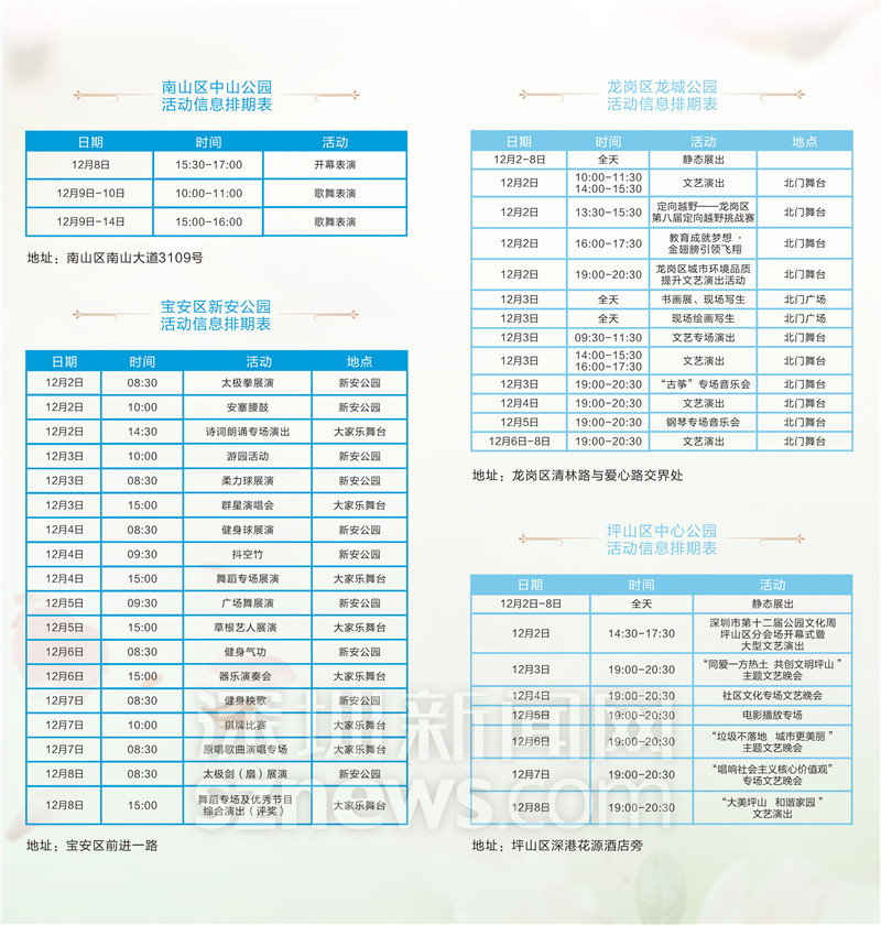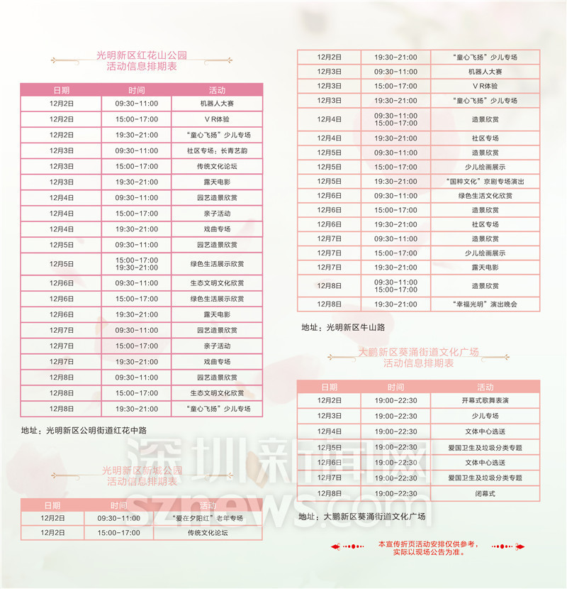 深圳新聞網(wǎng)12月1日訊(記者 鐘鴻冰 通訊員 崔嵩)一年一度的公園文化節(jié)即將到來,12月2日-12月8日,2017年第十二屆公園文化周將在全市27家公園舉行。本屆公園文化周緊密結(jié)合創(chuàng)建“國家森林城市”和打造“世界著名花城”重點工作,以“美麗深圳 多彩生活”為主題,充分展現(xiàn)美麗宜居的城市環(huán)境及豐富多彩的城市文化生活。