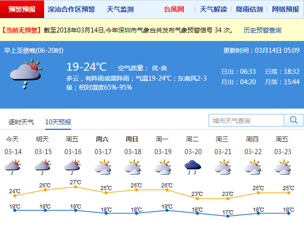深圳新聞網(wǎng)3月14日訊(記者 何暢)深圳市氣象臺3月14日05:09發(fā)布,14-15日多云有陣雨或雷陣雨;16日陣雨轉(zhuǎn)多云,沿海有霧;17-18日多云;19日多云轉(zhuǎn)分散陣雨。