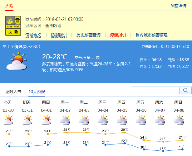 根據(jù)市氣象局發(fā)布消息,本周末到下周初溫暖舒適,無明顯降雨:30日至4月4日多云間晴天,早晚有輕霧,空氣較干燥,30日氣溫20-28℃;5日夜間至6日冷空氣影響,有分散陣雨,北風(fēng)加大,氣溫下降。近期無明顯降水,需加強防火安全管理。