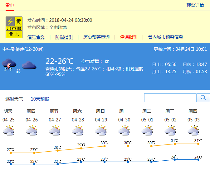 預(yù)計24日陰天有雷陣雨,有時雨勢較大,氣溫下降;25日降雨結(jié)束,轉(zhuǎn)多云,可見陽光。