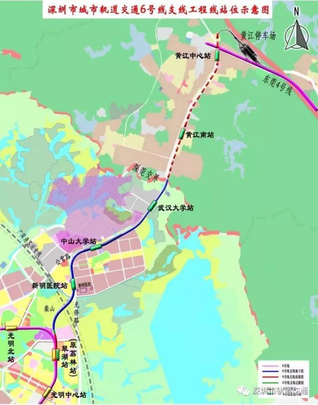 深圳地鐵6號(hào)線(xiàn)支線(xiàn)位于深圳市光明區(qū),起點(diǎn)設(shè)在6號(hào)線(xiàn)翠湖站東側(cè)(翠湖站為兩線(xiàn)換乘車(chē)站)、終點(diǎn)位于公常路深莞邊界,連接光明中心區(qū)和光明北區(qū)、中山大學(xué),與規(guī)劃建設(shè)的東莞1號(hào)線(xiàn)南延線(xiàn)銜接,包括4站4區(qū)間:翠湖站(原荔林站)、新明醫(yī)院站、中山大學(xué)站、武漢大學(xué)站。
