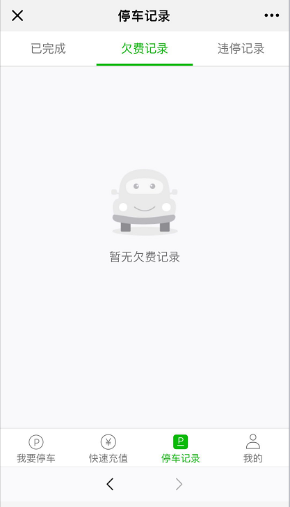 在這個(gè)界面還有“快速充值、停車記錄、我的”等導(dǎo)航入口