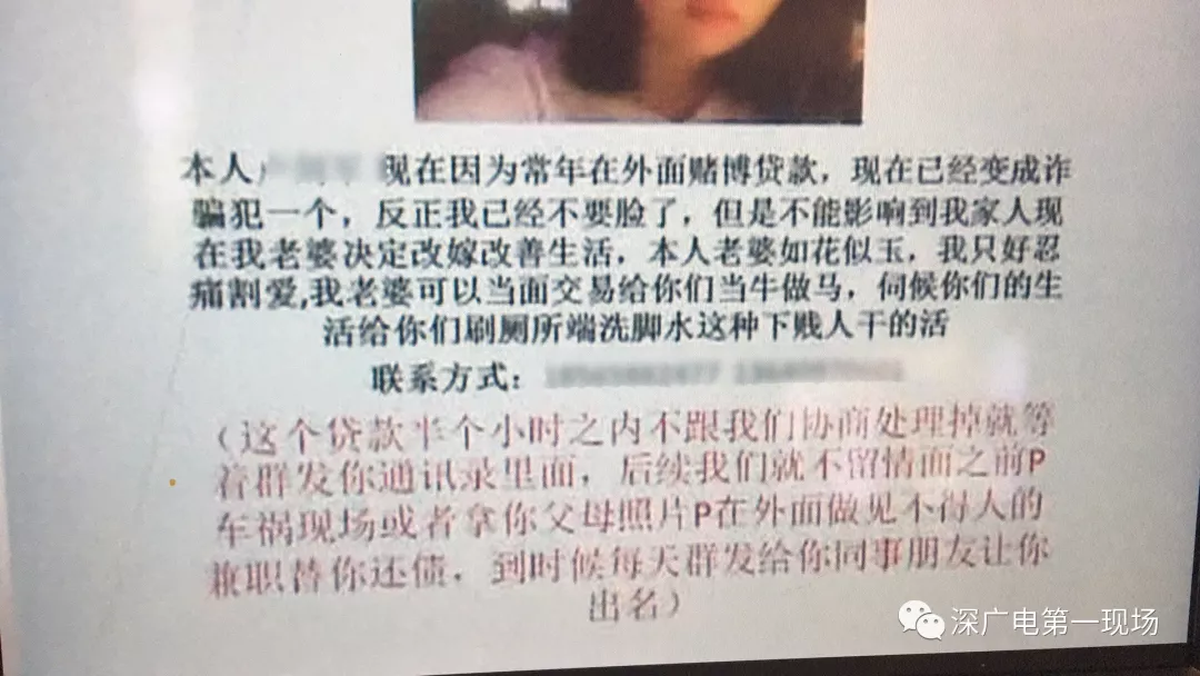 今天上午,記者在龍崗坪地一小區(qū)外見到了盧先生,他告訴記者,最近手機(jī)收到這樣一張圖片,圖片恰巧是他的一位女性朋友頭像,下面還配上一些關(guān)于“幫盧先生還債”的不實文字信息,內(nèi)容是盧先生已經(jīng)成了詐騙犯,現(xiàn)在正在當(dāng)“洗腳妹”幫盧先生還賬,圖片上還有盧先生的個人資料和電話號碼。