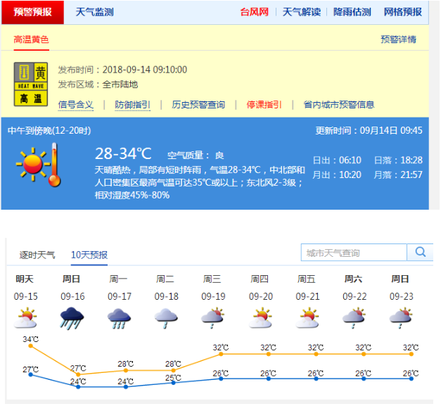 14-15日晴天間多云,天氣炎熱,能見度較差,午后有熱雷雨,局地最高氣溫35℃或以上;16-17日受臺風(fēng)“山竹”影響風(fēng)雨明顯。