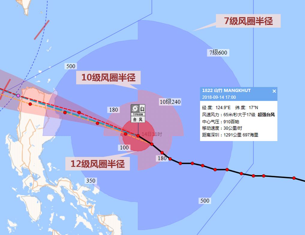 9月14日17時(shí)其位于距我市1291公里的菲律賓以東洋面,中心風(fēng)力17級以上(65米/秒,相當(dāng)于234公里/小時(shí)),中心最低氣壓910百帕,將以30公里/時(shí)的速度向西北方向移動。