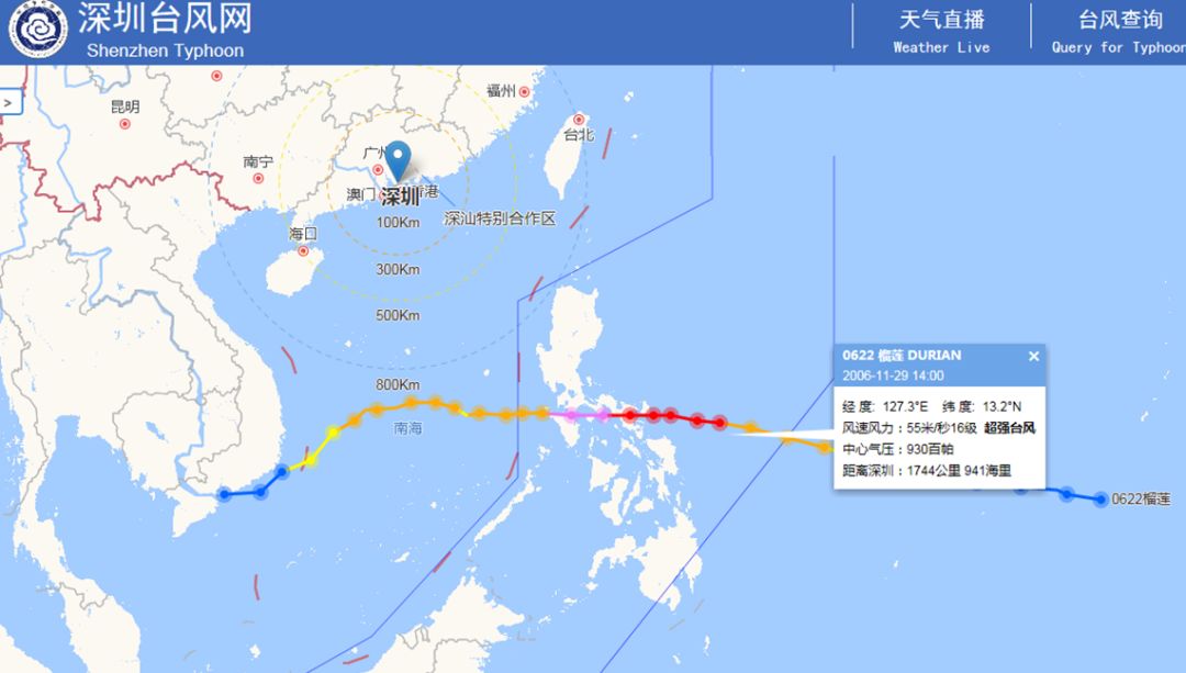 臺風(fēng)“榴蓮”(泰國命名)是2006年11月30日在菲律賓登陸的超強(qiáng)臺風(fēng),雖然對我國沒有什么風(fēng)雨影響,但在菲律賓卻造成了上百人死亡、失蹤以及近100萬人直接受災(zāi),并且其二次登陸也給越南造成了上百艘船艇沉沒。
