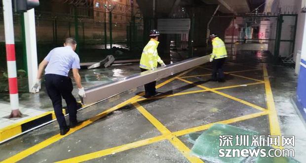 邊檢民警冒雨在拾取被強(qiáng)臺(tái)風(fēng)掀倒現(xiàn)場通關(guān)標(biāo)識(shí)牌