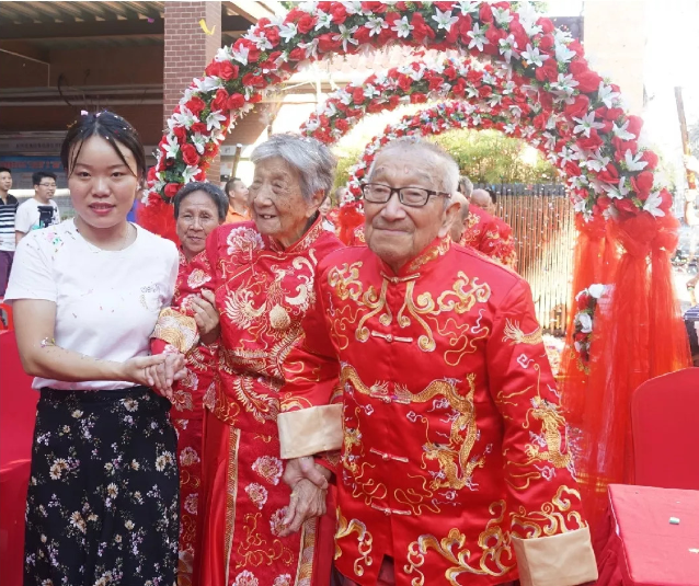 蛇口街道南水社區(qū)居民耿玉璽與王月鳳兩位老人已經(jīng)攜手走過69年,一直有個(gè)遺憾藏在心里——兩人年輕時(shí)沒有舉辦過婚禮,連一張結(jié)婚照片都沒有。日前,二老的遺憾得到彌補(bǔ),愿望得以實(shí)現(xiàn)。南水社區(qū)黨委以開展民生微實(shí)事為契機(jī),為包括耿玉璽與王月鳳夫婦在內(nèi)的社區(qū)15對老年夫婦舉辦了一場別開生面的夕陽美集體金婚慶典活動。眾多嘉賓及老人的親朋好友、子女兒孫到場見證,獻(xiàn)上掌聲和祝福。