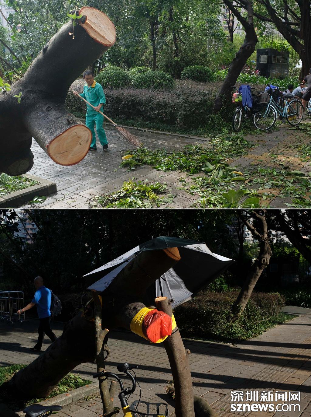 蓮花西地鐵站A出口前后對比圖(上圖:2018年9月17日,臺風(fēng)過后,路面一片狼藉,環(huán)衛(wèi)工人正在清掃。下圖 2018年9月18日下午五點,路面清掃完畢,恢復(fù)整潔)