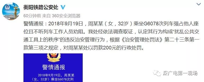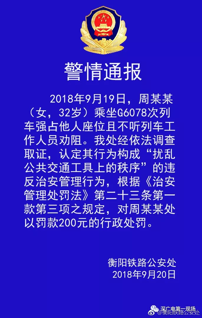 今天上午10點(diǎn)多,@衡陽(yáng)鐵路公安處發(fā)布警情通報(bào)稱(chēng),2018年9月19日,周某某(女,32歲)乘坐G6078次列車(chē)強(qiáng)占他人座位且不聽(tīng)列車(chē)工作人員勸阻。