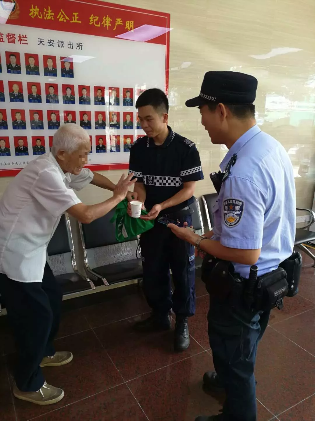 9月19日中午12時30分許,天安派出所巡防隊員在福田汽車站警銀亭值守時,發(fā)現(xiàn)一名疑似走失老人,巡防員上前詢問情況后立即將情況上報值班室。巡邏民警邱志堅趕到現(xiàn)場,由于老人高齡,語言不通,無法獲得更多有效信息,于是帶回派出所進(jìn)一步處理。