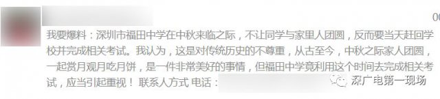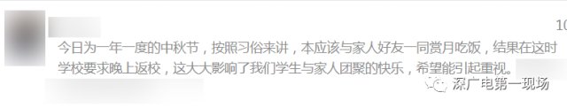 今天,深圳市高級中學(xué)、深圳市福田中學(xué)、沙井中學(xué)、東方英文書院的一些高中學(xué)生,通過在線留言等多種方式,向欄目反映,中秋節(jié)是法定假日,但他們卻沒法和家人一起吃飯團(tuán)聚,更別提賞月看晚會(huì)了,原因是學(xué)校要求寄宿的學(xué)生今天晚上要提早返校,參加晚自習(xí)或者考試。